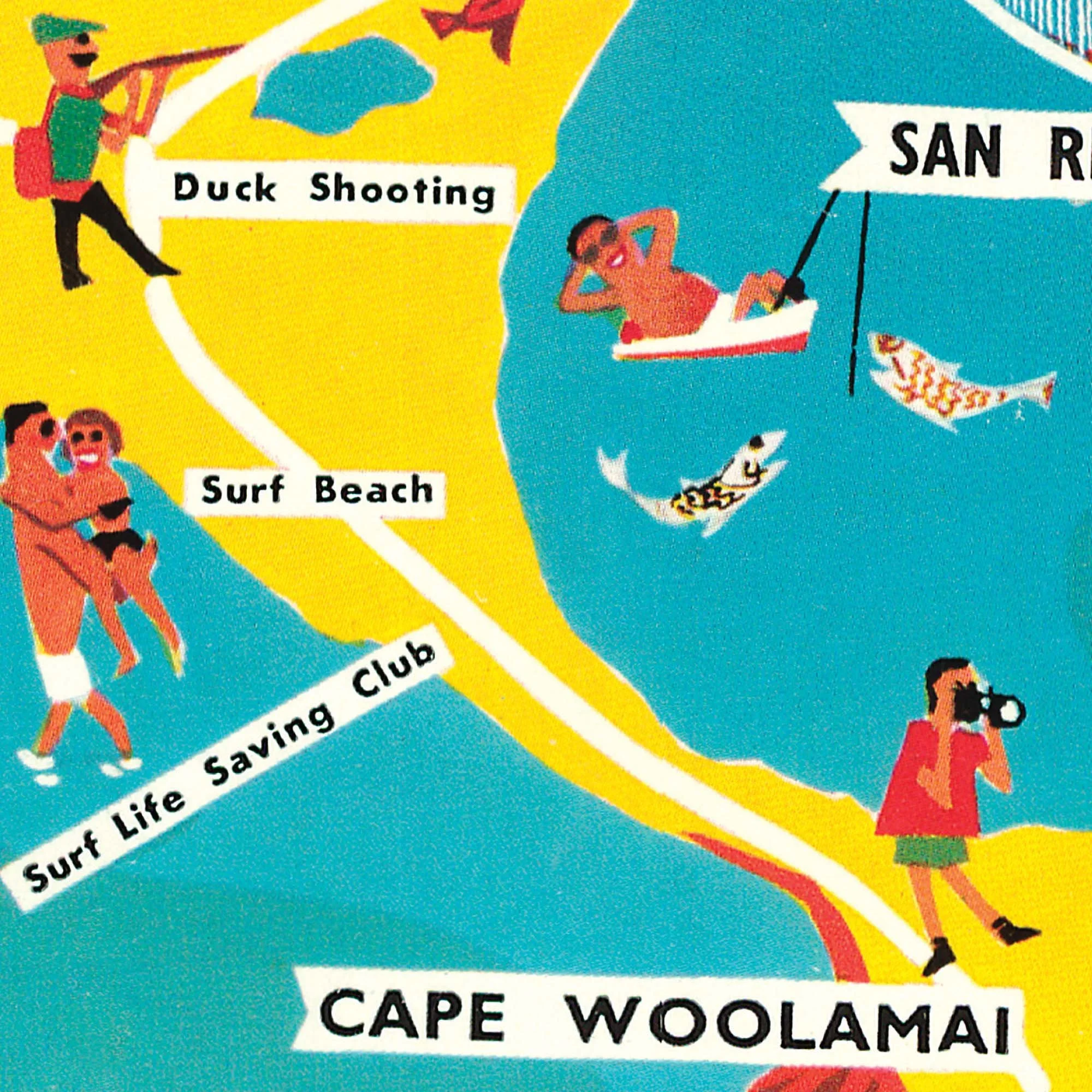 This tourist map from the 1950s has everything you want – sun, sand, water, penguins and fantastic summer nostalgic holiday memories. All preserved and restored with it's original retro half-tone dot vibe. Perfect for your Phillip Island beach house or holiday rental.